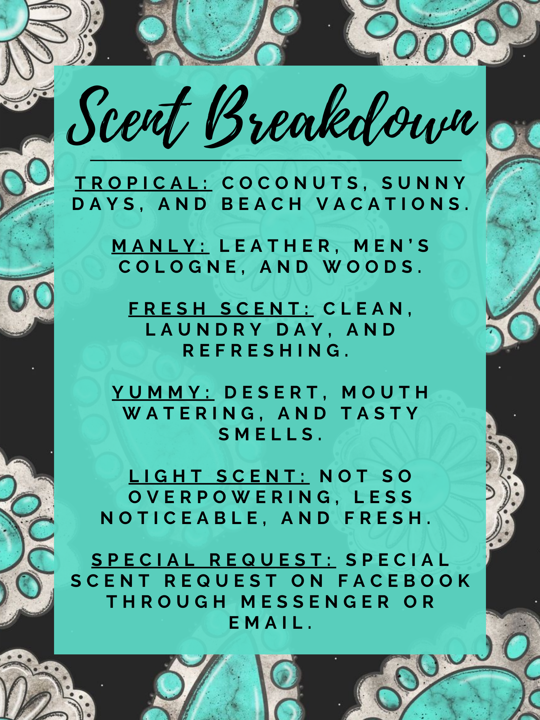 Special Request: special scent request on Facebook through Messenger or email.